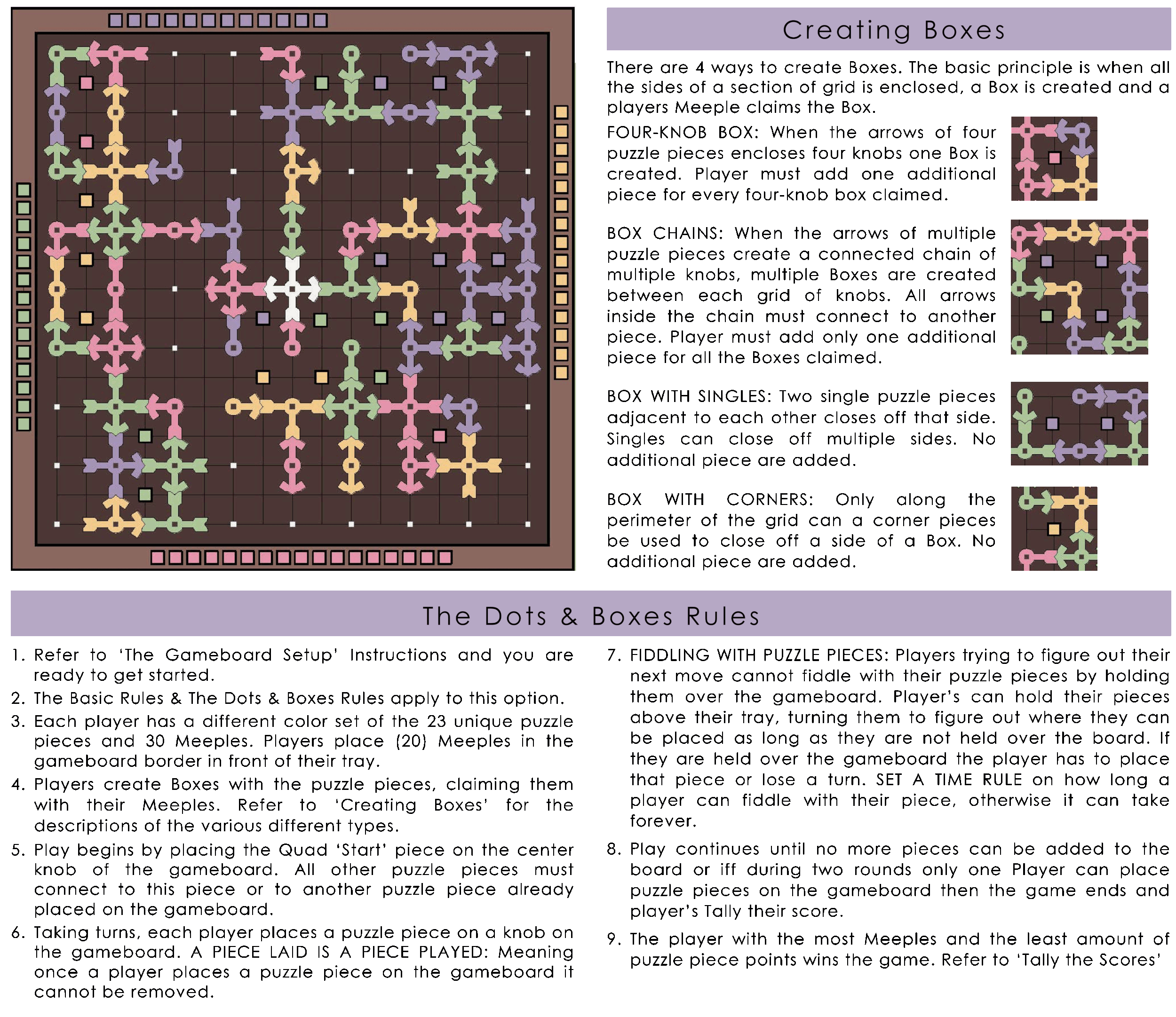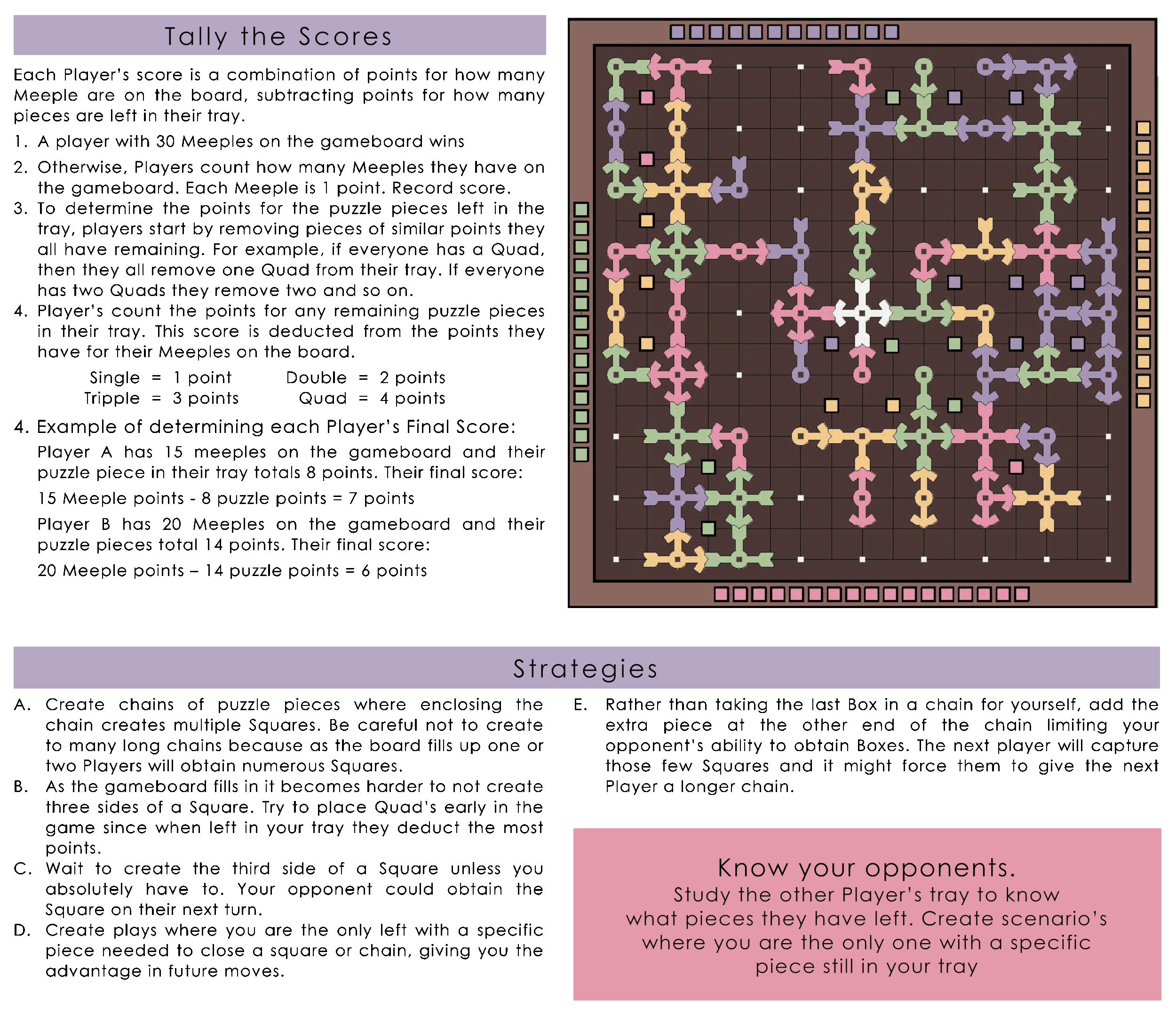 In this Play Option the goal is for players to create as many Box’s as possible, claiming them with their Meeples. Once no more puzzle pieces can be added to the gameboard player’s Tally their Scores. Highest score wins. Play time: 30 - 45 minutes Ages 10+